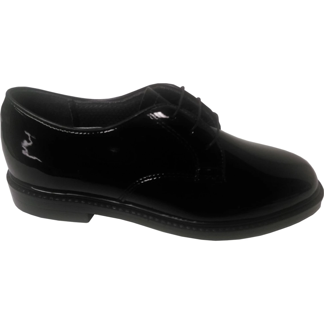 This oxford has a shiny poromeric upper, with a cambrelle lining, a full poron sock lining on a contoured heel cup, with a high gloss edge and poly sole.